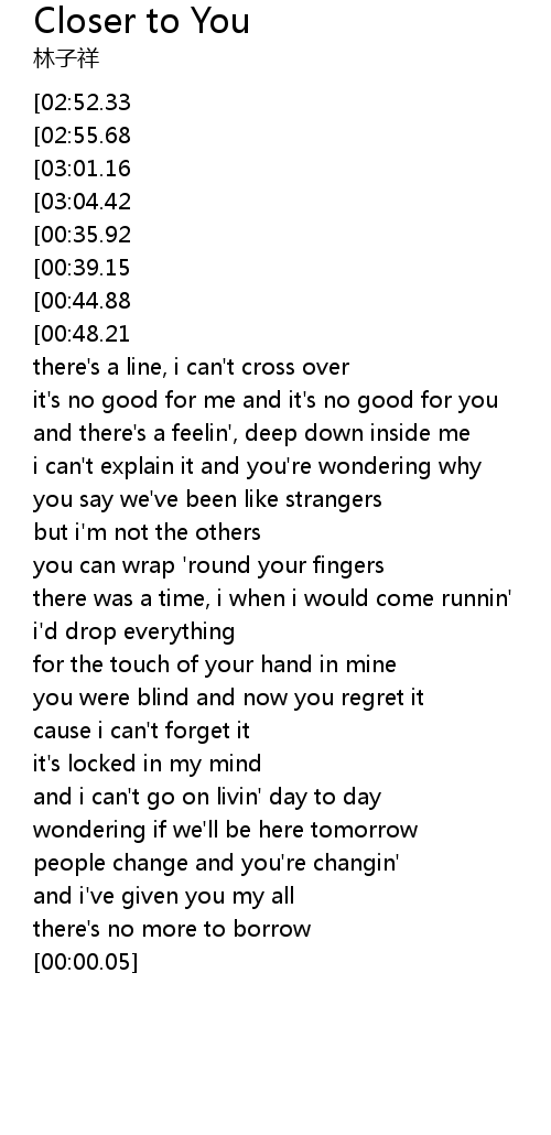 | [03:13.32][02:55.68][01:33.36][00:21.14] | closer to you, get closer to me |