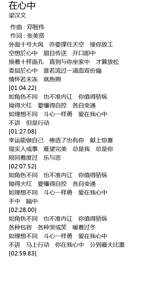 | [01:14.89] | 如理想不同 斗心一样勇 爱在我心中 |