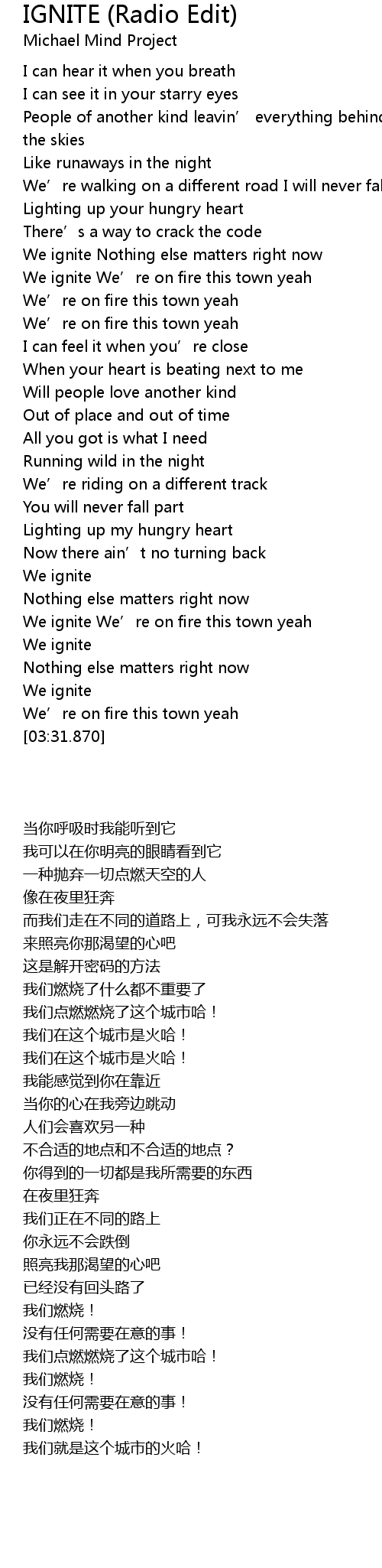 | [00:45.320] | We ignite We' re on fire this town yeah |