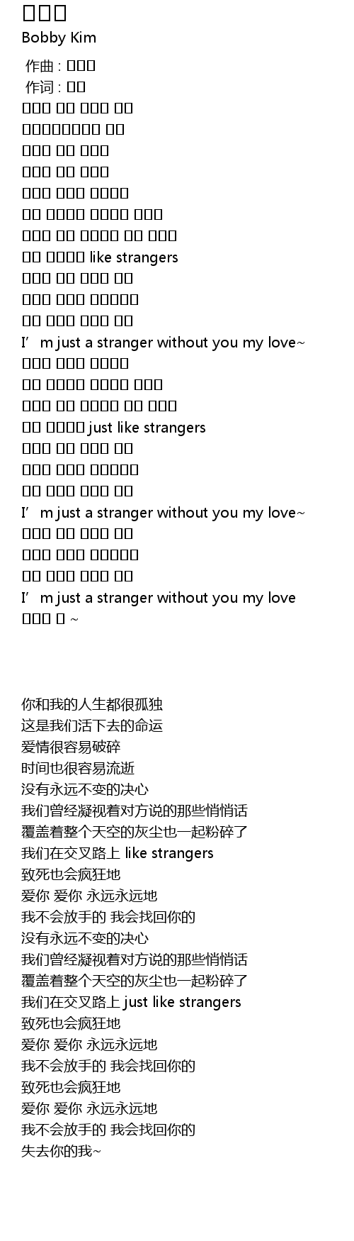 | [02:35.690] | I’m just a stranger without you my love~ |