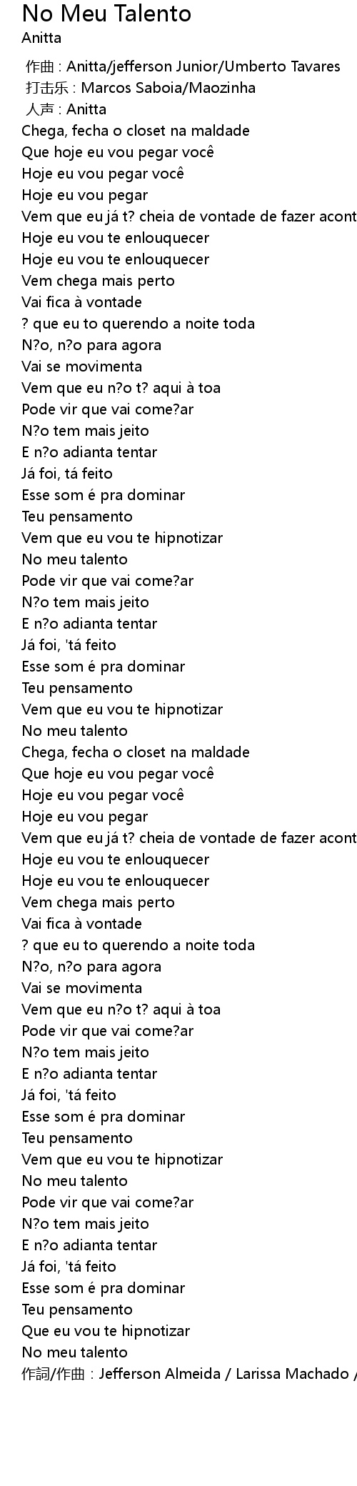 | [02:29.66] | 作詞/作曲:Jefferson Almeida / Larissa Machado / Umberto Tavares |