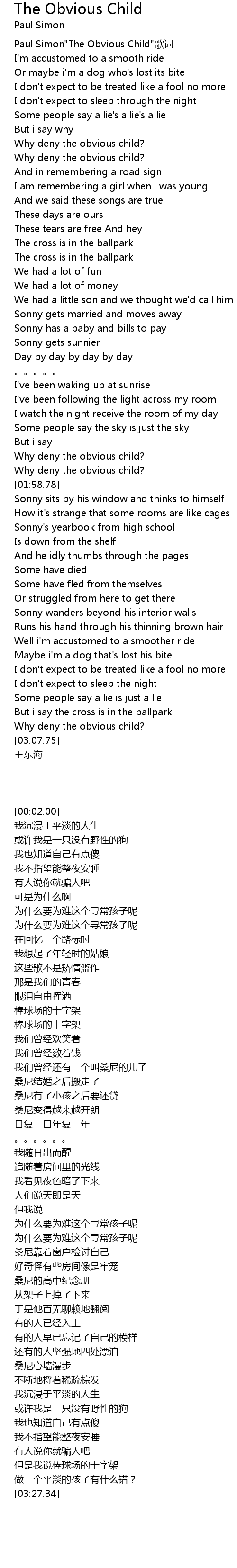 | [00:02.00] | Paul Simon"The Obvious Child"歌词 |