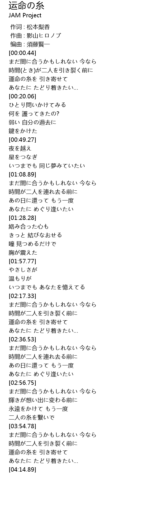 | [00:10.62] | 運命の糸を 引き寄せて |