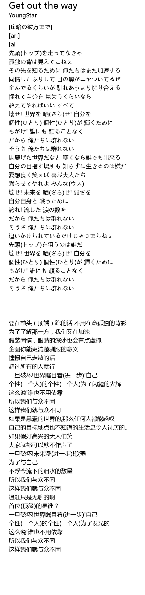 | [01:07.90] | 壊せ! 世界を 晒(さら)せ! 自分を |