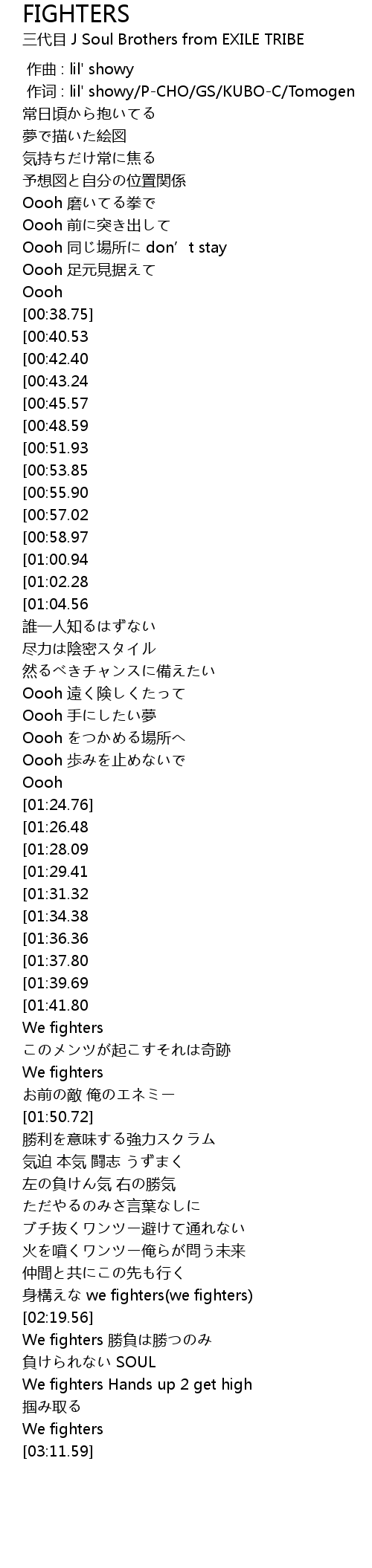 | [02:37.19][00:57.02] | We fighters 今がやる時 |