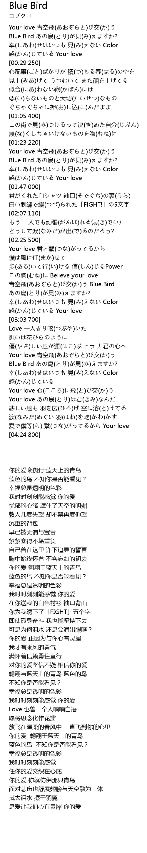 | [00:10.800] | Blue Bird niǎo jiàn? |