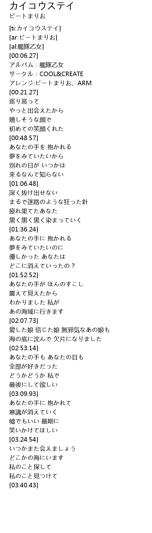 | [00:15.27] | アレンジ:ビートまりお、ARM |