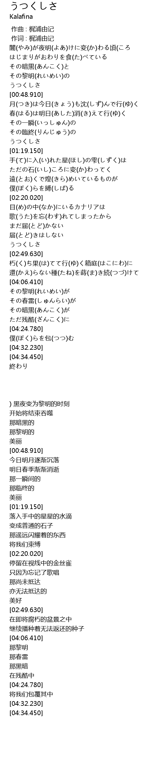 | [00:53.300] | 月(つき)は今日(きょう)も沈(しず)んで行(ゆ)く |
