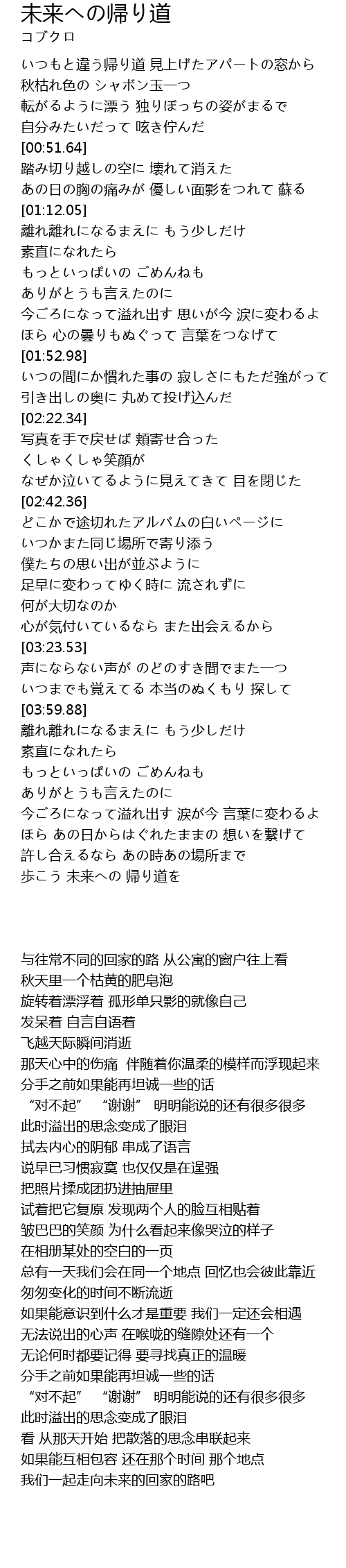 | [04:48.95] | 歩こう 未来への 帰り道を |
