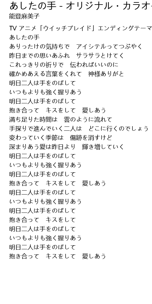| [00:07.487] | あしたの手 |