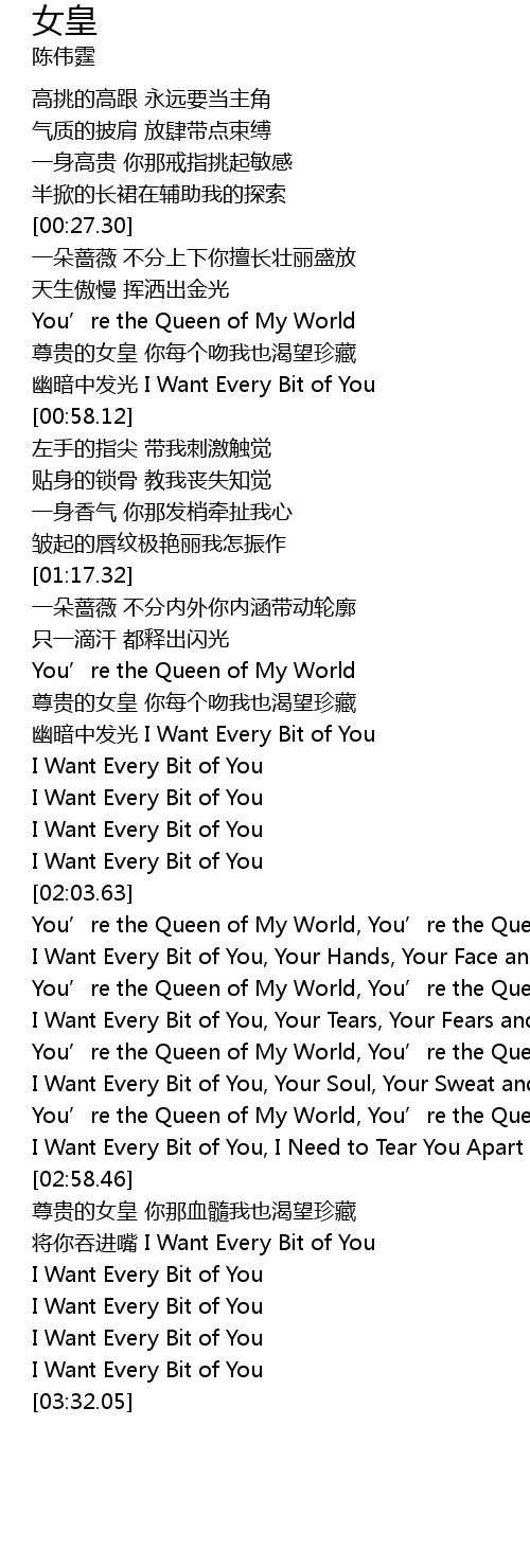 | [00:42.25] | 尊贵的女皇 你每个吻我也渴望珍藏 |