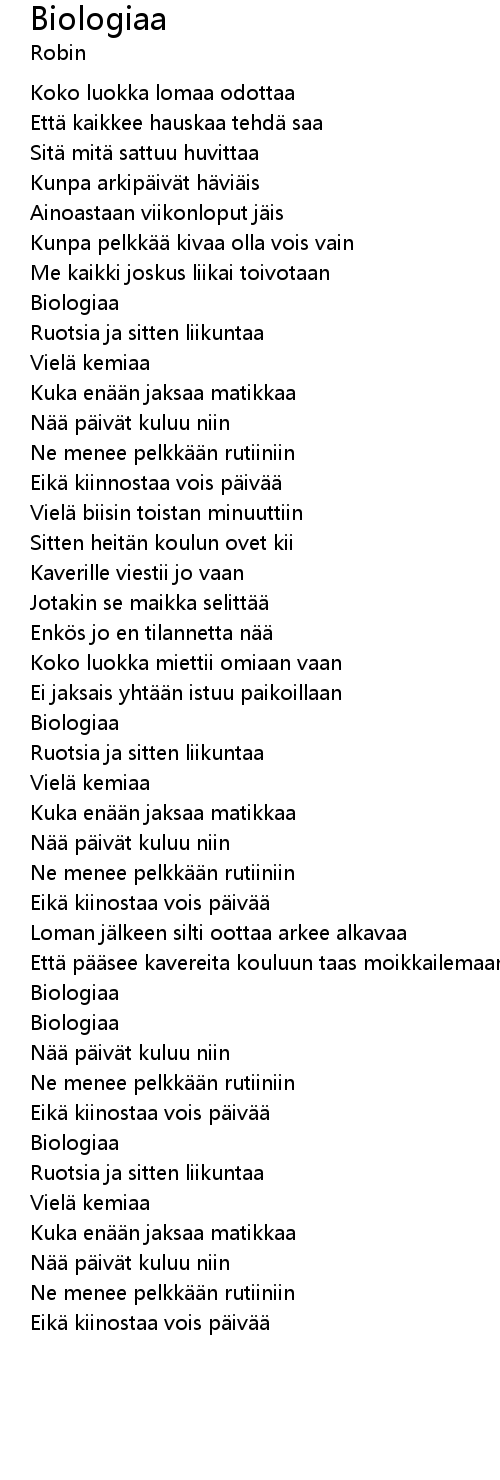 | [02:14.46] | Loman jälkeen silti oottaa arkee alkavaa |