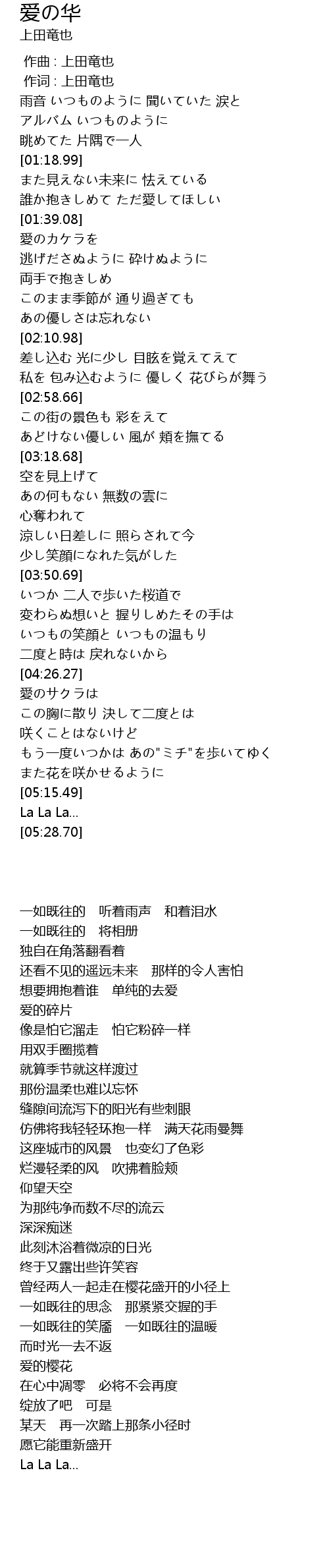 | [02:43.82] | 私を 包み込むように 優しく 花びらが舞う |
