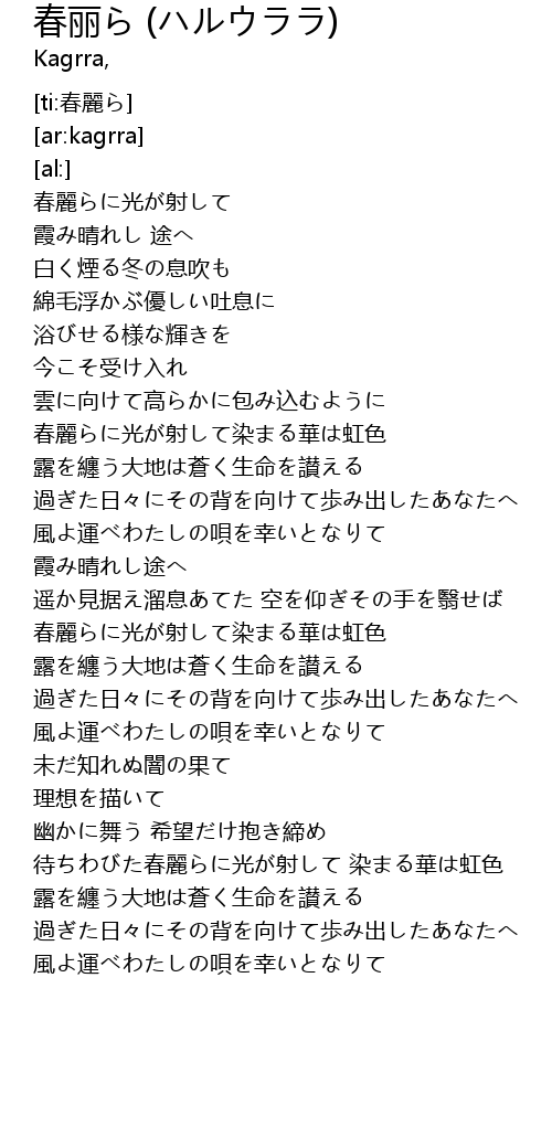 | [01:25.36] | 春麗らに光が射して染まる華は虹色 |