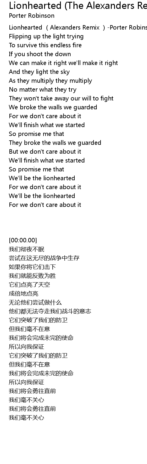 | [00:00.00] | Lionhearted (Alexanders Remix )-Porter Robinson /Urban Cone |