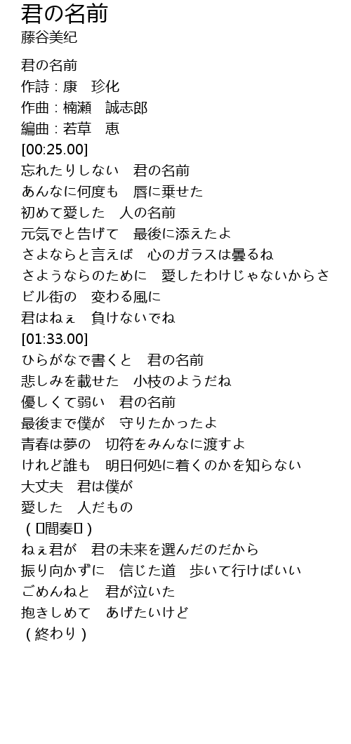 | [01:38.60] | ひらがなで書くと 君の名前 |
