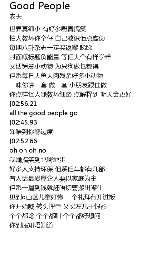 | [02:59.60][02:45.93][02:32.14][01:42.54][01:01.26] | Where'd all the good people go 睇唔到你喺边度 |