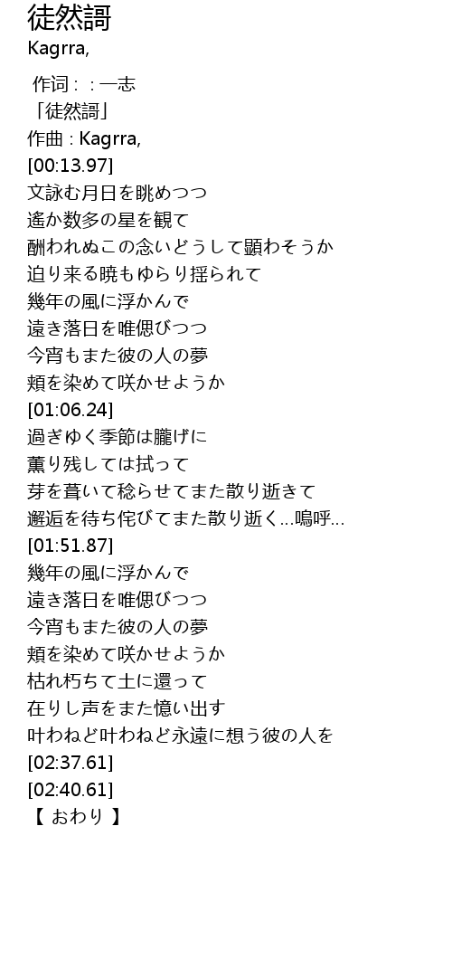 | [02:06.12] | 遠き落日を唯偲びつつ |