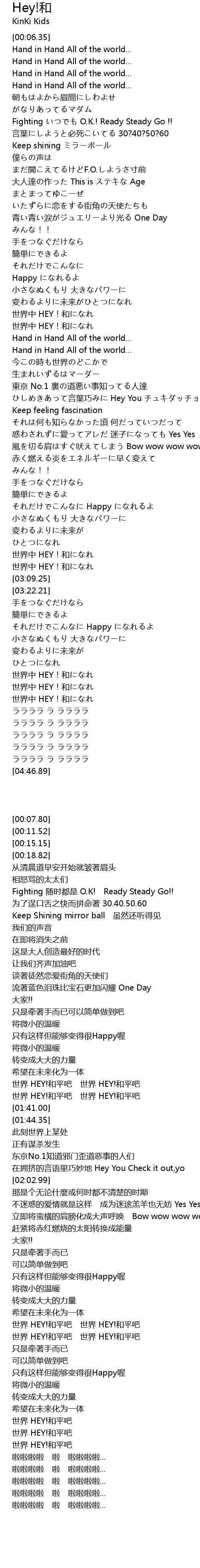 | [04:10.35] | shì jiè zhōng HEY! hé |