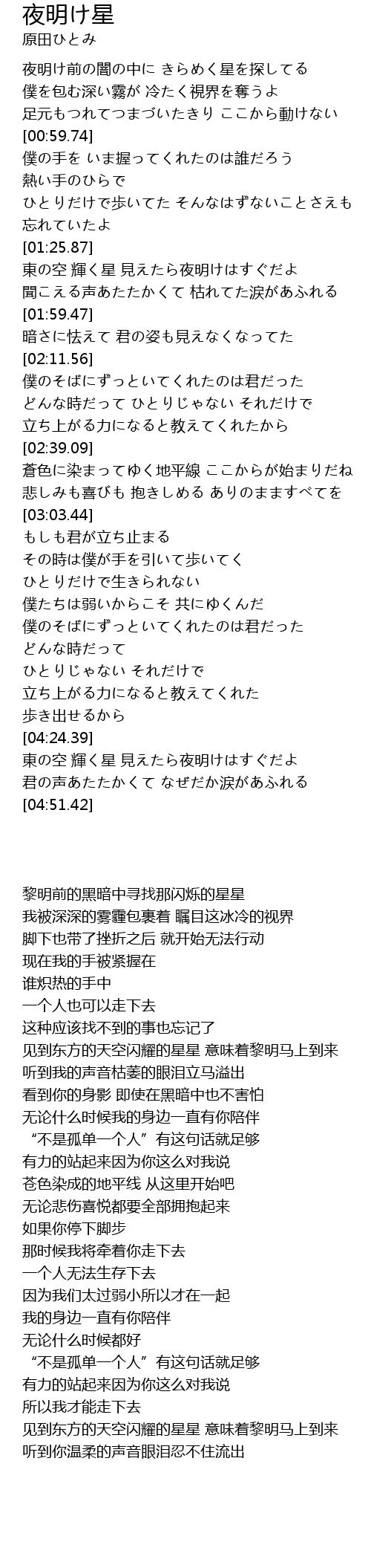 | [04:27.54] | 東の空 輝く星 見えたら夜明けはすぐだよ |
