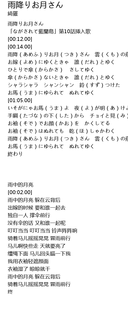 | [01:46.23] | 雨降(あめふ)りお月(つき)さん 雲(くも)の蔭(かげ) |