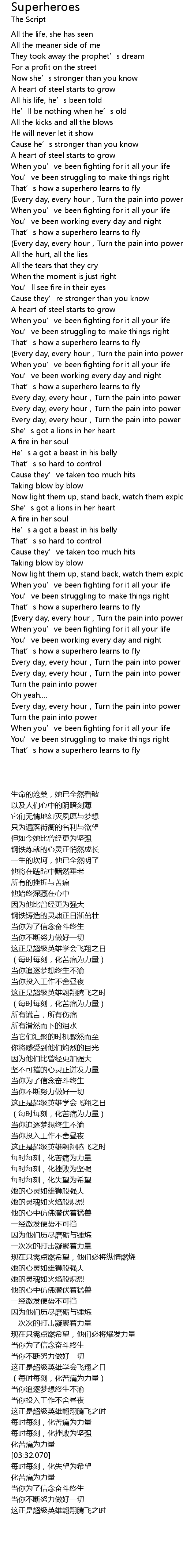 | [03:03.440] | Every day, every hour, Turn the pain into power |