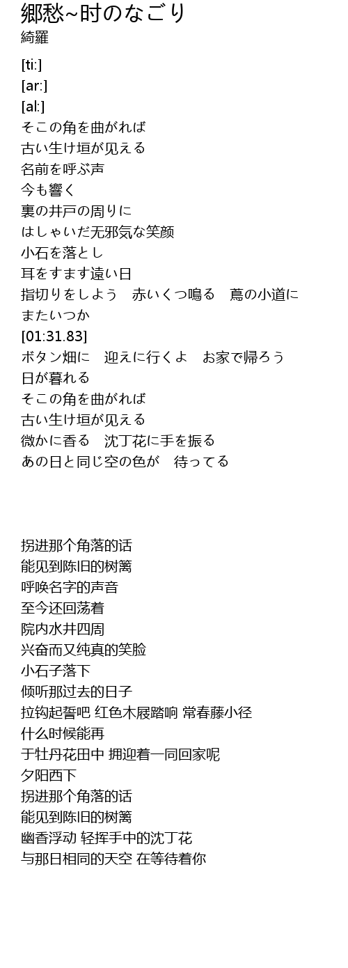 | [01:06.92] | 指切りをしよう 赤いくつ鳴る 蔦の小道に |