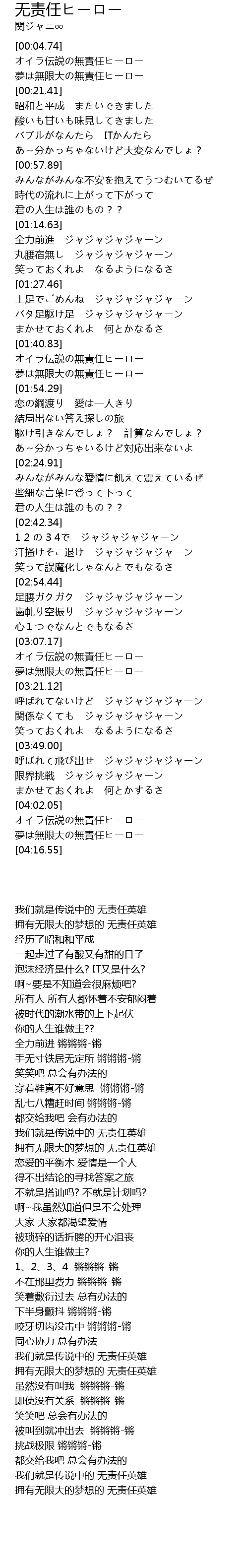 | [00:14.80] | 夢は無限大の無責任ヒーロー |