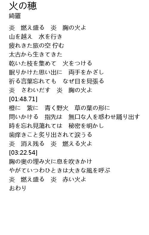 | [01:57.38] | 橙に 紫に 青く野火 草の葉の形に |