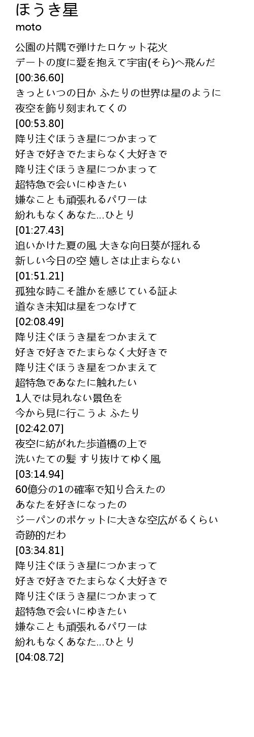 | [03:44.71] | 降り注ぐほうき星につかまって |