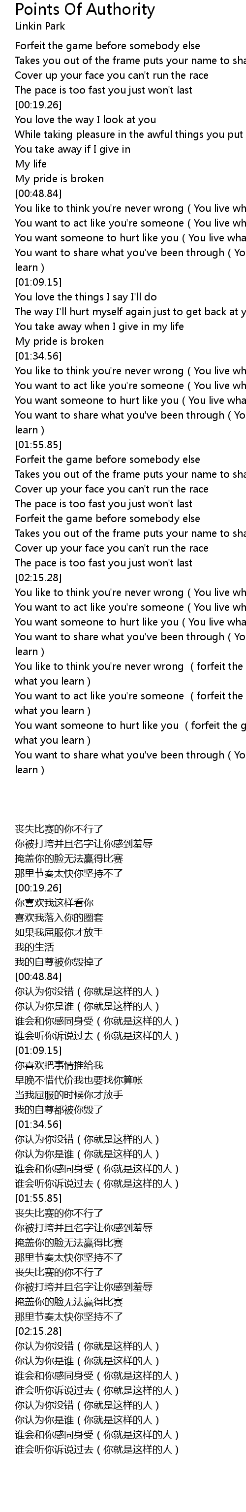 | [02:35.59] | You like to think you're never wrong (forfeit the game)(You live what you learn) |