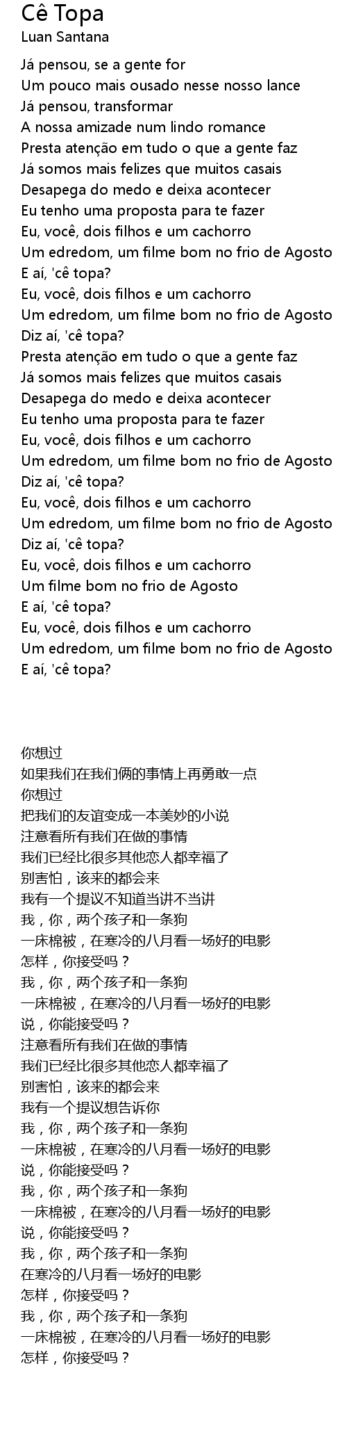 | [02:23.000] | E aí, 'cê topa? |