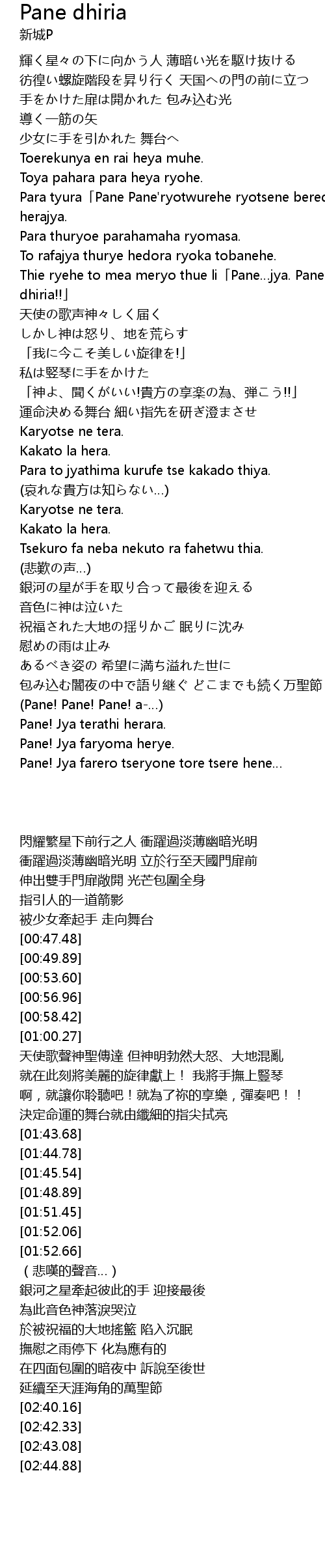 | [01:00.27] | Thie ryehe to mea meryo thue li Pane jya. Pane, jya! Pane dhiria!! |
