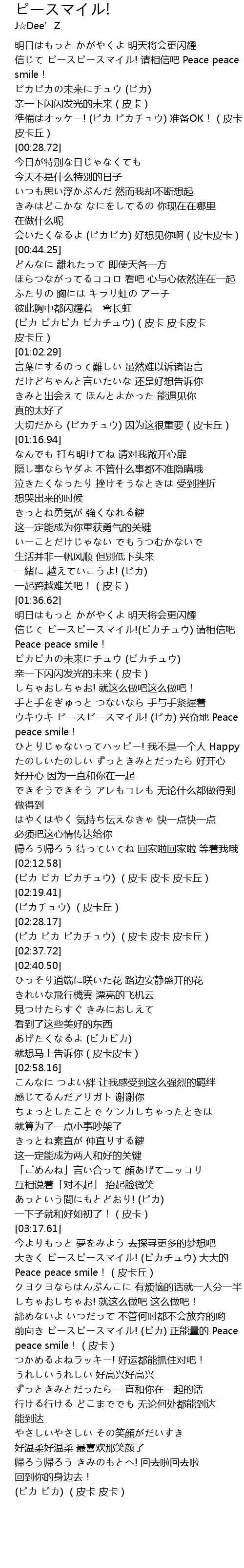 | [03:34.14] | 前向き ピースピースマイル! (ピカ) 正能量的 Peace peace smile!(皮卡) |