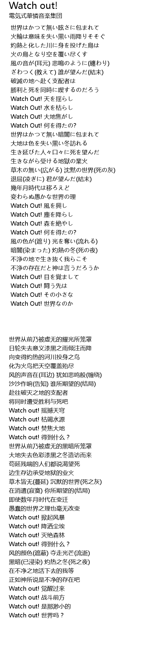 | [03:20.500] | Watch Out! shì jiè |