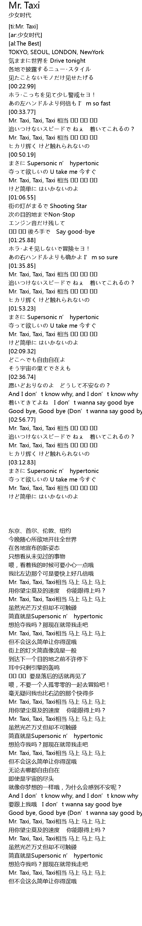 | [03:20.84] | Mr. Taxi, Taxi, Taxi 相当 즉시 즉시 즉시 |