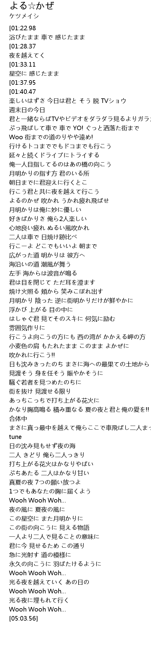 | [02:22.10][01:22.98][04:19.44][04:00.20][00:24.62] | よるのかぜ 浴びたまま 車で 感じたまま |