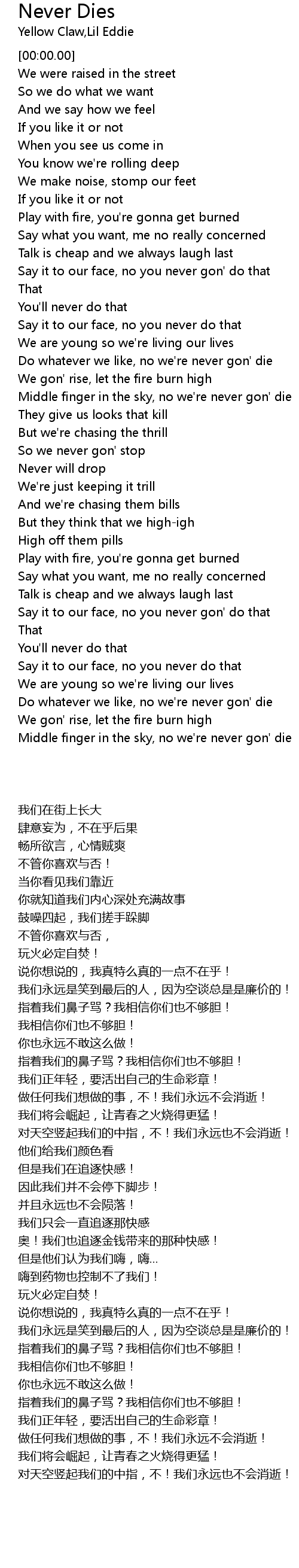 Middle finger in the sky, no we're never gon' die |
