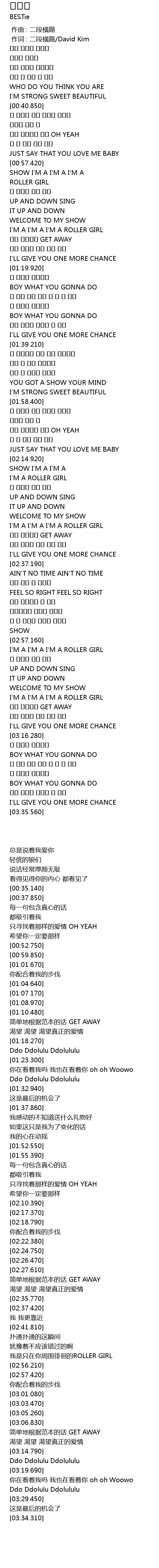 | [00:01.00] | 作词 : 二段横踢/David Kim |