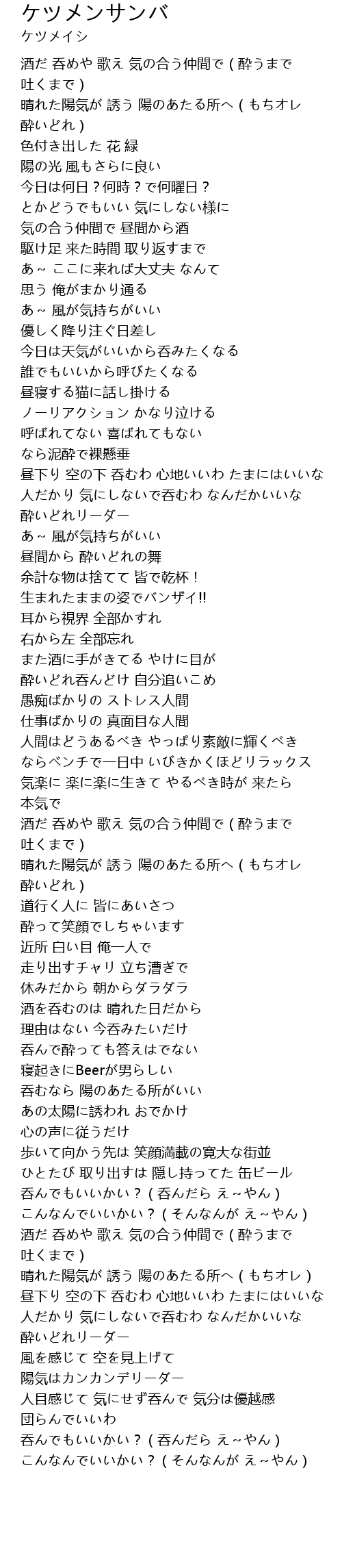 | [03:51.880] | 人だかり 気にしないで呑むわ なんだかいいな 酔いどれリーダー |
