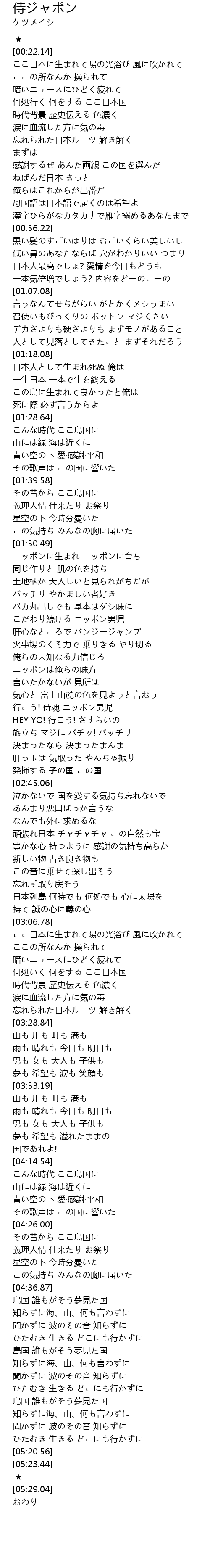 | [02:23.61] | 行こう! 侍魂 ニッポン男児 |