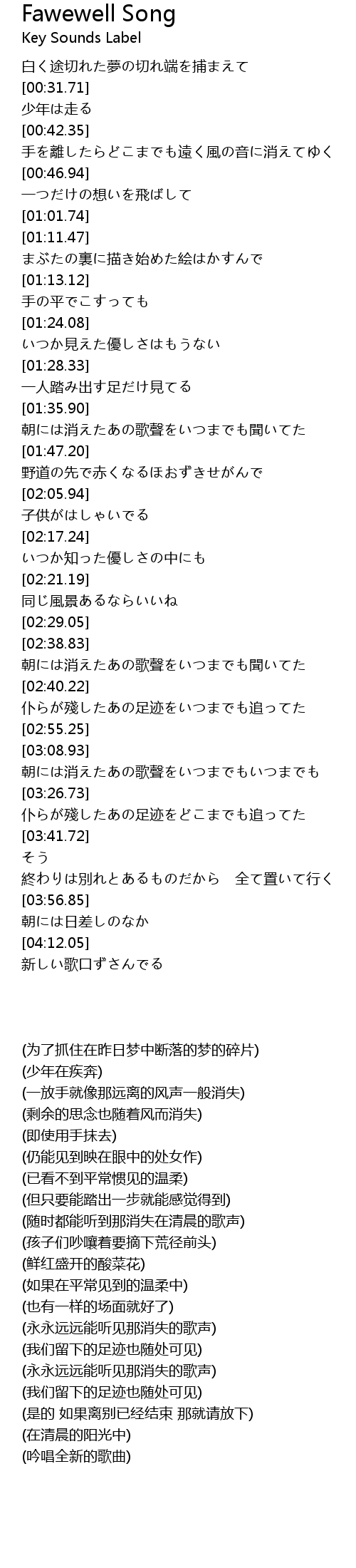 | [00:31.21] | 白く途切れた夢の切れ端を捕まえて |