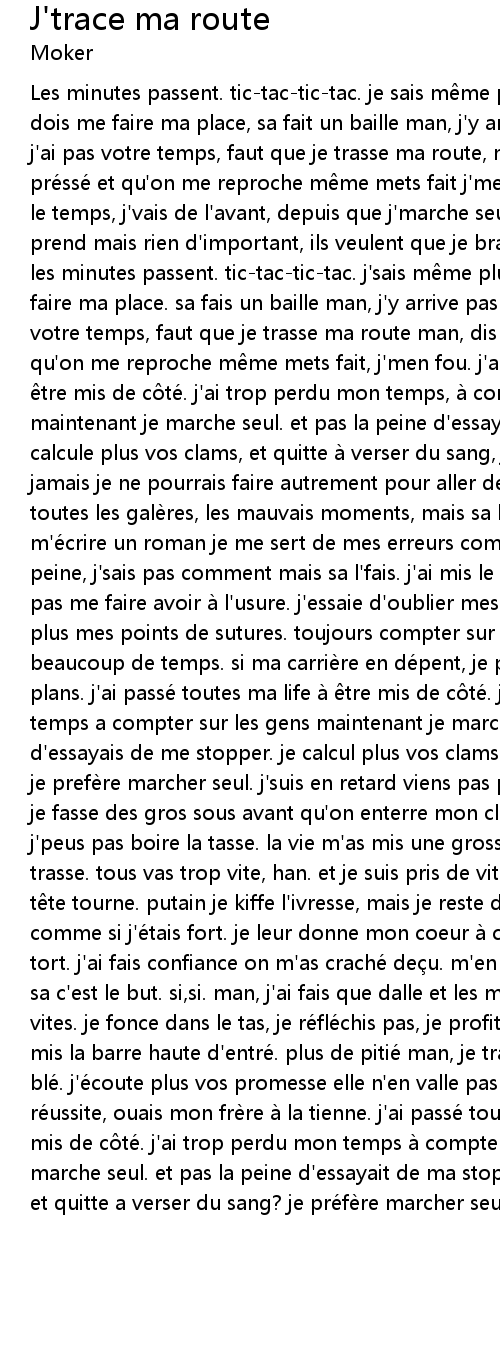 | Les minutes passent. tic-tac-tic-tac. je sais même plus ce que j'ai fais. je dois me faire ma place, sa fait un baille man, j'y arrive pas mais j'essaie. j'ai pas votre temps, faut que je trasse ma route, man dis leur que je suis préssé et qu'on me reproche même mets fait j'men fou. maintenant je n'ai plus le temps, j'vais de l'avant, depuis que j'marche seul. on me dis pour qui tu te prend mais rien d'important, ils veulent que je braque le geun . non, non, non . les minutes passent. tic-tac-tic-tac. j'sais même plus c'que j'ai fais, j'dois faire ma place. sa fais un baille man, j'y arrive pas mais j'essaie. j'ai pas votre temps, faut que je trasse ma route man, dis leurs que je suis pressé. et qu'on me reproche même mets fait, j'men fou. j'ai passé toutes ma life, à être mis de côté. j'ai trop perdu mon temps, à comptais sur les gens. maintenant je marche seul. et pas la peine d'essayait de me stopper, je ne calcule plus vos clams, et quitte à verser du sang, je préfère marcher seul. jamais je ne pourrais faire autrement pour aller de l'avant je dois oublier, toutes les galères, les mauvais moments, mais sa le fait. pas besoin de m'écrire un roman je me sert de mes erreurs comme un bouclier. sortie de ma peine, j'sais pas comment mais sa l'fais. j'ai mis le cappe vers le futur, pour pas me faire avoir à l'usure. j'essaie d'oublier mes blessures. je ne regarde plus mes points de sutures. toujours compter sur les gens, m'a fais perdre beaucoup de temps. si ma carrière en dépent, je prefère gérer seul mes plans. j'ai passé toutes ma life à être mis de côté. j'ai trop perdu mon temps a compter sur les gens maintenant je marche seul. et pas le peine d'essayais de me stopper. je calcul plus vos clams. et quitte a verser du sang, je prefère marcher seul. j'suis en retard viens pas perdre mon temps. faut que je fasse des gros sous avant qu'on enterre mon clan. j'évite les obstacles, j'peus pas boire la tasse. la vie m'as mis une grosses gifles, j'en garde sa trasse. tous vas trop vite, han. et je suis pris de vitesse dans se manège m'as tête tourne. putain je kiffe l'ivresse, mais je reste droit, comme un homme, comme si j'étais fort. je leur donne mon coeur à ceux que j'aime mais j'ai tort. j'ai fais confiance on m'as craché deçu. m'en sortir, toucher le sommet, sa c'est le but. si,si. man, j'ai fais que dalle et les minutes passent trop vites. je fonce dans le tas, je réfléchis pas, je profite. tu s'en que j'ai mis la barre haute d'entré. plus de pitié man, je trace ma route, j'prend le blé. j'écoute plus vos promesse elle n'en valle pas la peine. trinke à ma réussite, ouais mon frère à la tienne. j'ai passé toutes ma life, à être mis de côté. j'ai trop perdu mon temps à compter sur les gens. maintenant je marche seul. et pas la peine d'essayait de ma stopper, je calcul plus vos clams et quitte a verser du sang? je préfère marcher seul. (x2) |