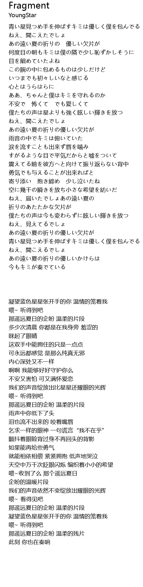 | [00:00.00] | 青い星見つめ手を伸ばすキミは優しく僕を包んでる |