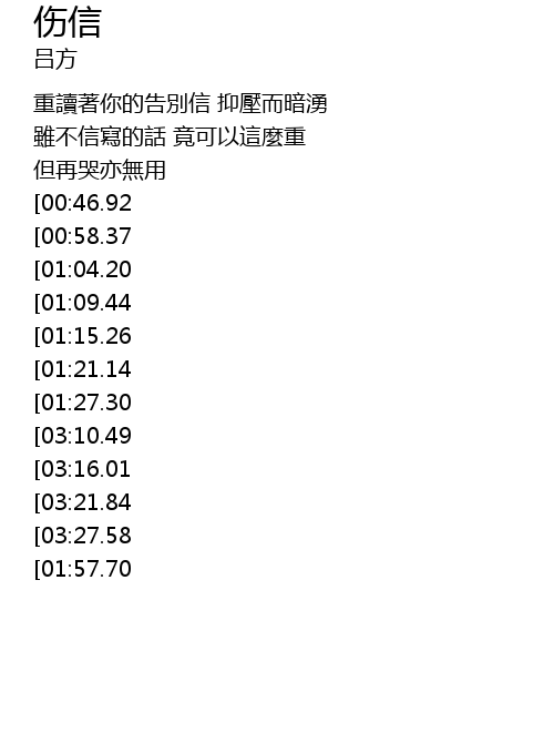 | [00:23.62] | 重讀著你的告別信 抑壓而暗湧 |