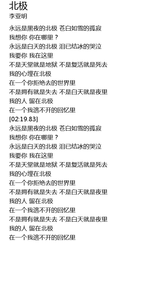 | [02:21.39] | 永远是黑夜的北极 苍白如雪的孤寂 |