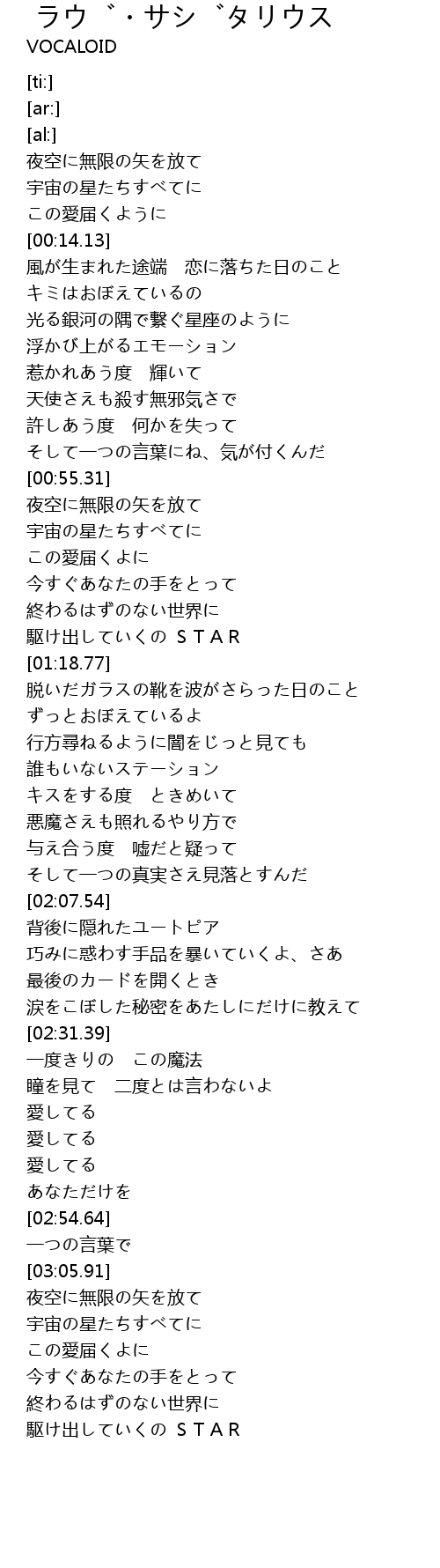 | [00:24.86] | 光る銀河の隅で繋ぐ星座のように |
