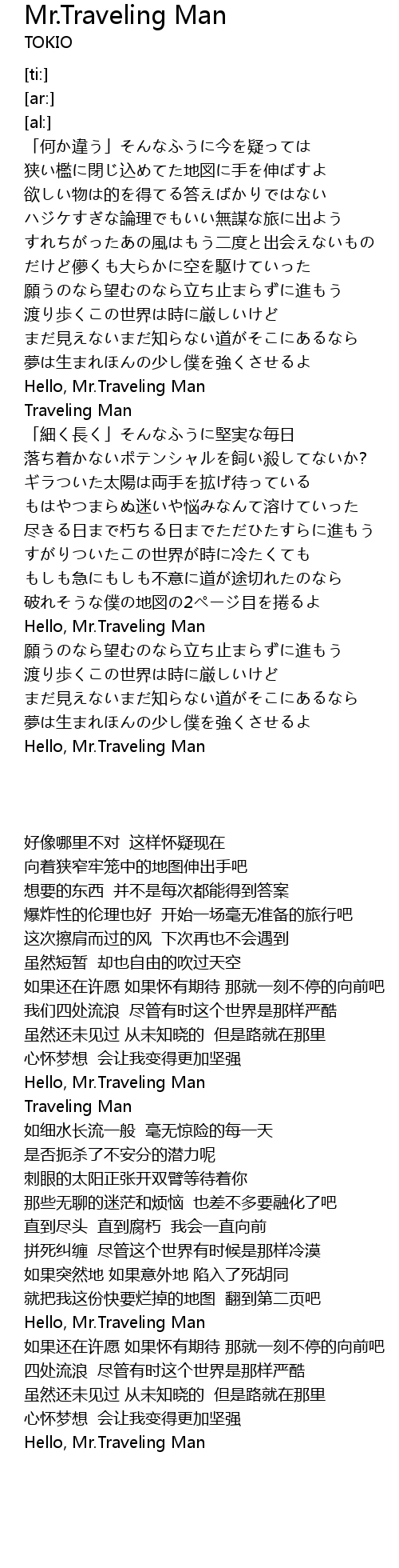 | [02:53.60] | Hello, Mr.Traveling Man |