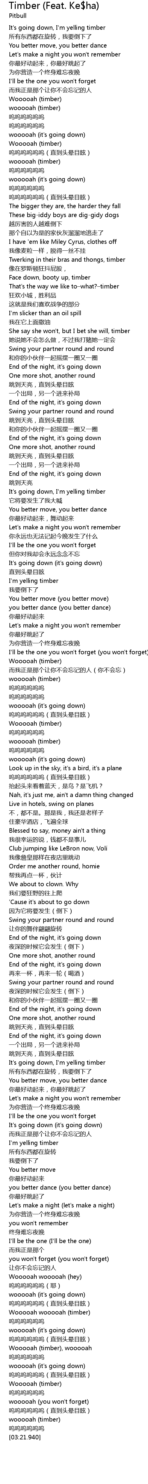 | [00:50.010] | She say she won't, but I bet she will, timber |