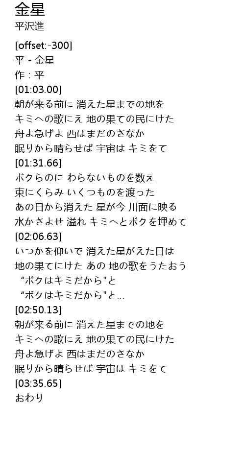 | [00:00.00] | 平 - 金星 |